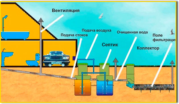Септик представляет собой конструкцию из двух или более расположенных в земле и сообщающихся между собой при помощи канализационной трубы резервуаров. Переработка канализационных стоков происходит в такой последовательности: